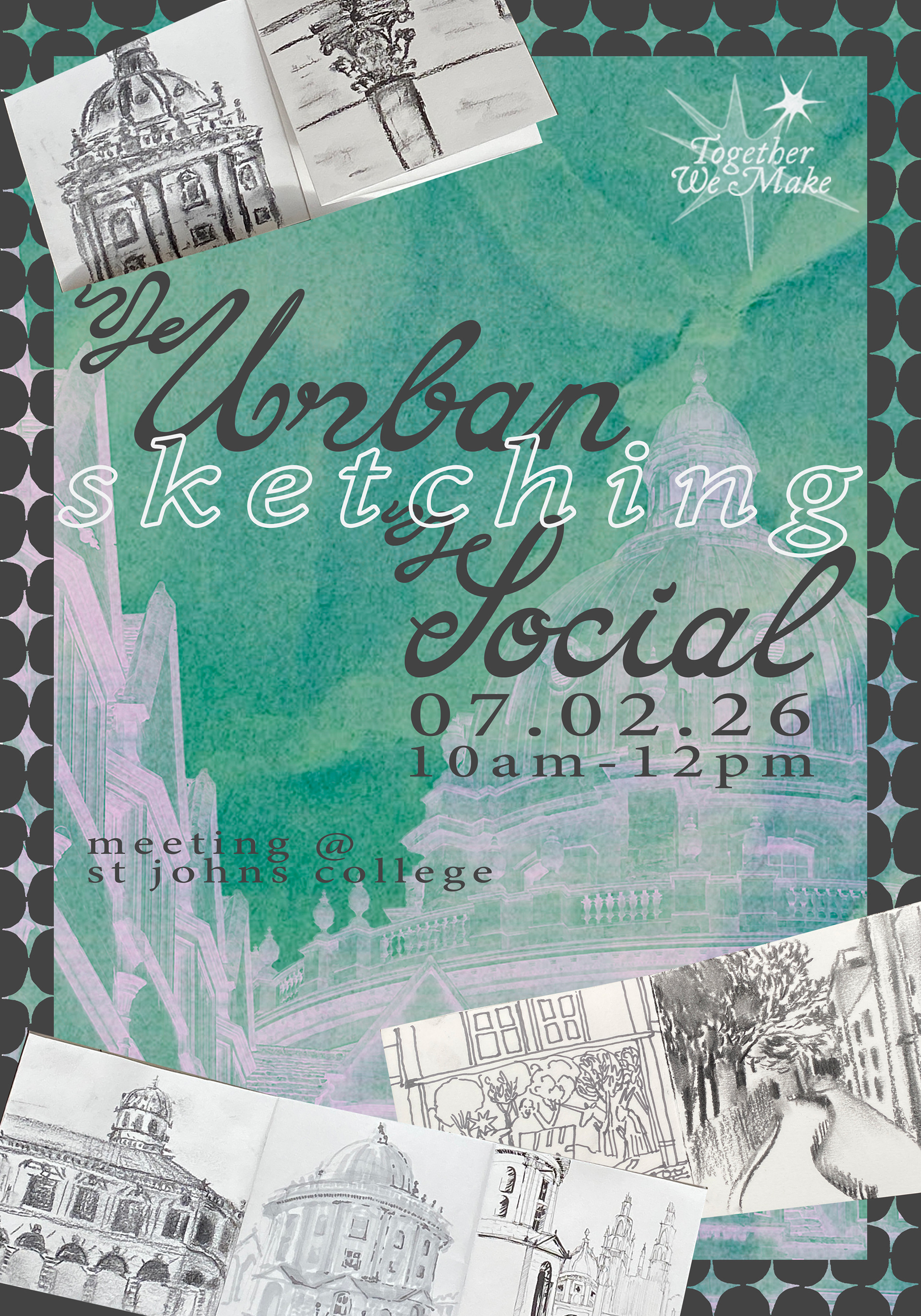 The Urban Sketching Social is a monthly social run by Oxford-based artist Joanna Clay, with a focus on building creative community and encouraging people to grow in confidence to sketch outdoors. The socials have a relaxed atmosphere and are suitable for all skill levels!